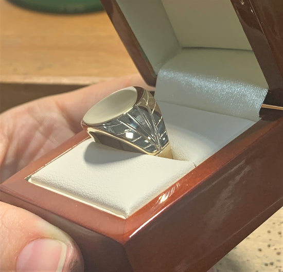 Designed based on his grandfather's wedding ring. Large oval signet ring in 9ct yellow gold with a hand carved pattern.
